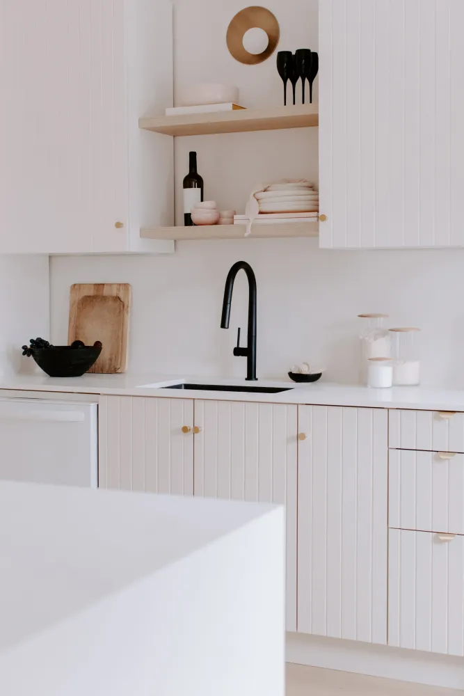 Quy tắc vàng là giữ mặt bàn bếp trống trải. Hãy cất giữ mọi đồ dùng không thường xuyên sử dụng vào tủ kín và chỉ để lại các vật dụng thiết yếu hàng ngày trên mặt bếp để tạo cảm giác thoáng đãng.