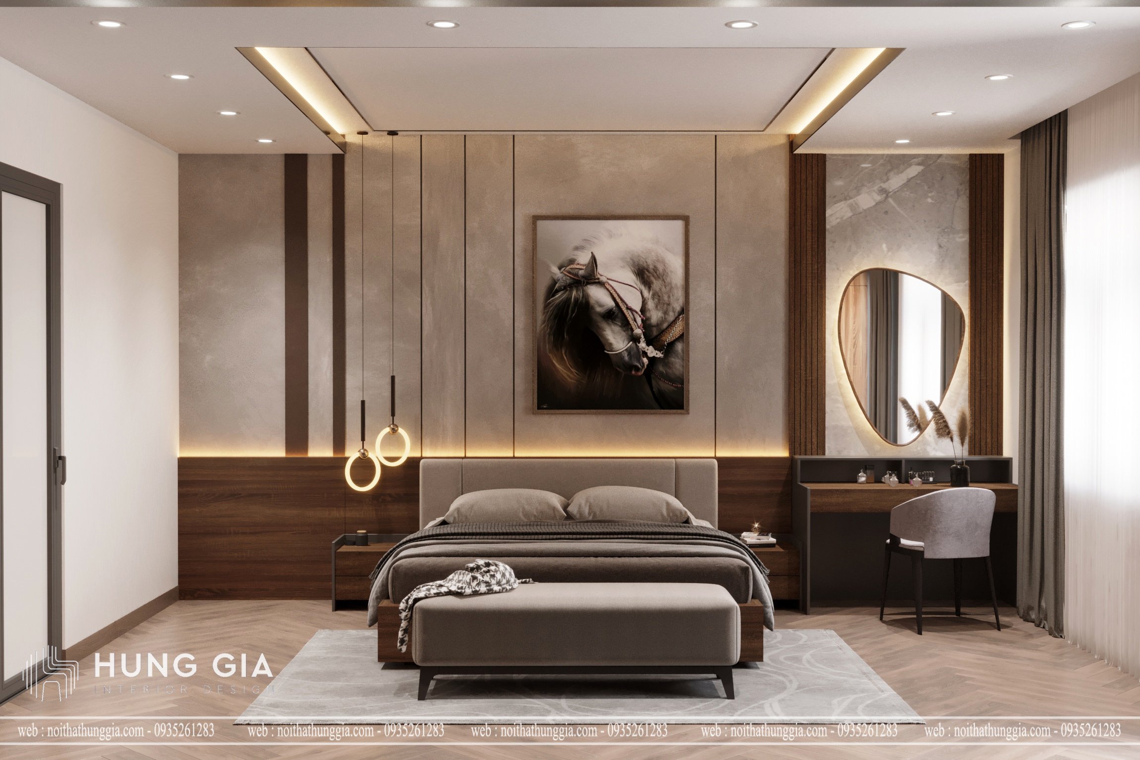 - Phong cách Hiện đại (Modern): Đường nét tinh tế, màu sắc trung tính, vật liệu bóng bẩy hoặc gỗ tự nhiên.