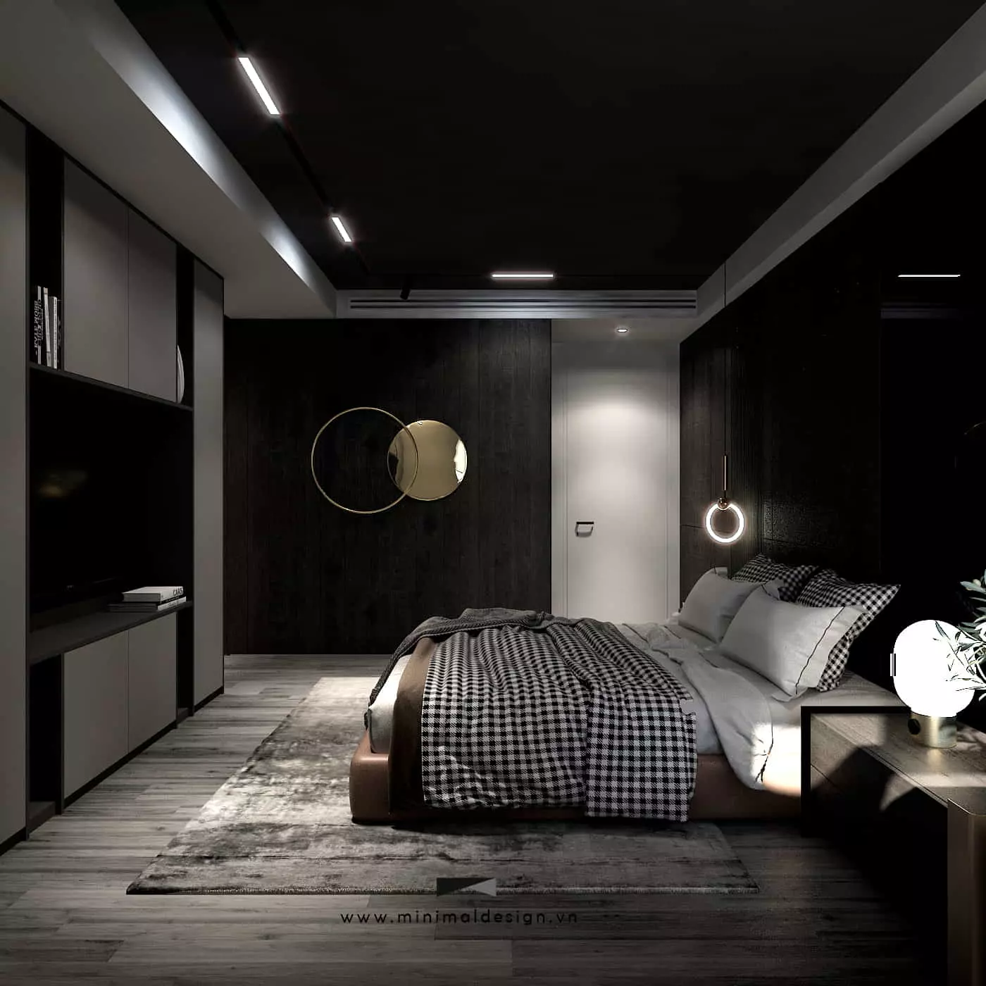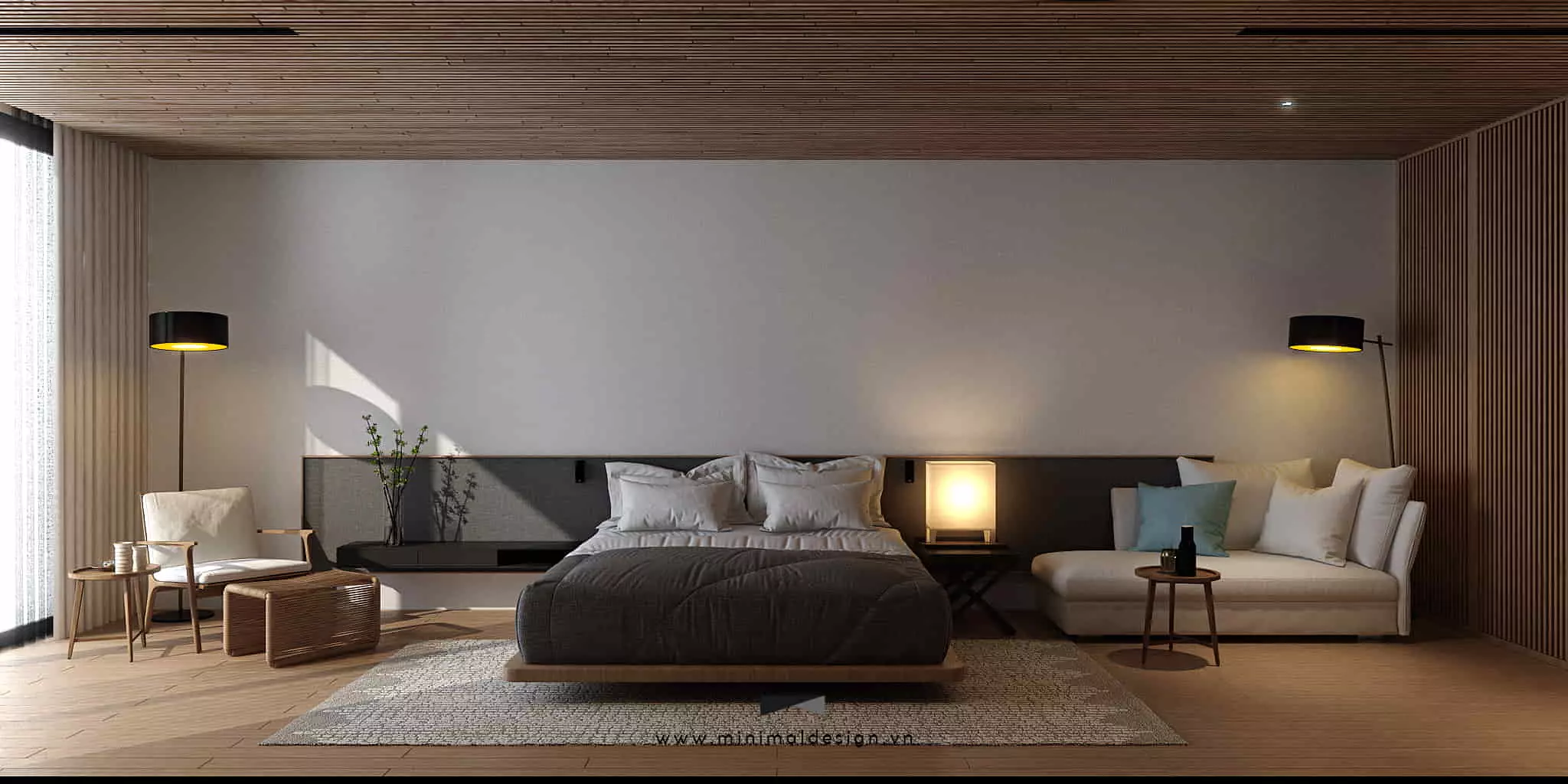 Nội thất phòng ngủ theo phong cách tối giản ưu tiên các đường nét thẳng, gọn gàng, bề mặt phẳng mịn. Các món đồ nội thất như giường, tủ quần áo, bàn đầu giường thường có thiết kế vuông vắn hoặc bo góc nhẹ nhàng, không có họa tiết cầu kỳ hay chi tiết trang trí thừa thãi. Mục tiêu là tạo ra một không gian sạch sẽ, ngăn nắp, giúp tâm trí được thư thái.
